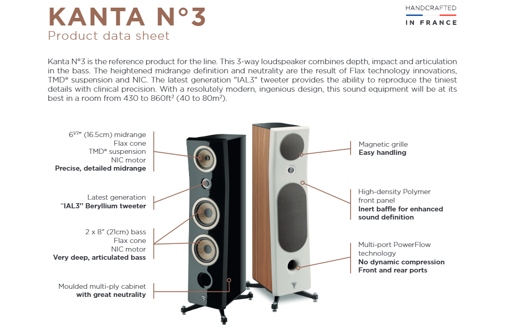 Ovaj hi-fi zvučnik kombinuje dubinu, udar i artikulaciju basa. Definicija i neutralnost srednjeg opsega su izuzetni, zahvaljujući prednostima francuske lanene membrane. IAL visokotonac najnovije generacije reprodukuje najfinije detalje sa hirurškom preciznošću.