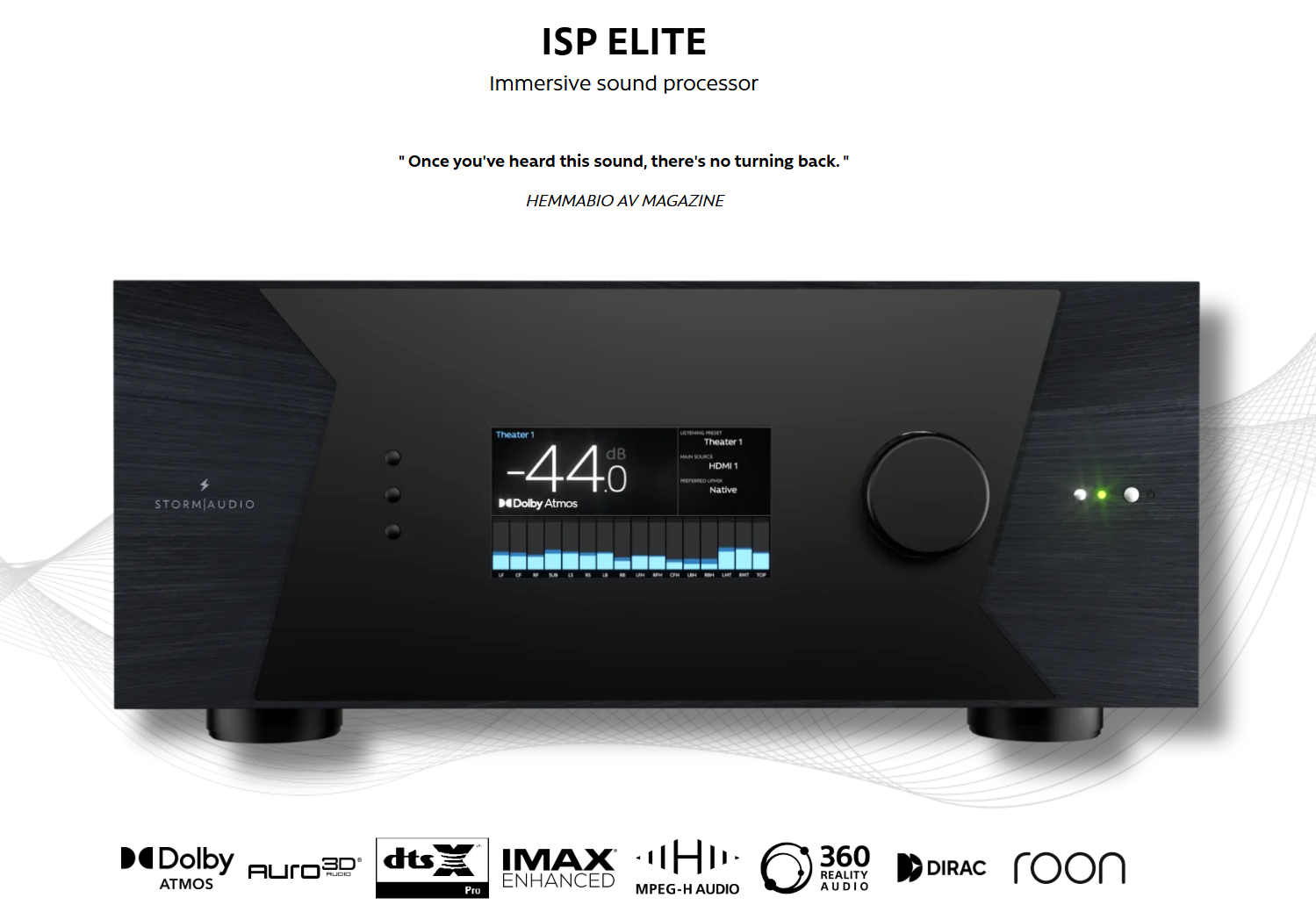 Višestruko nagrađivan kao najbolji zvučni procesor za kućni bioskop, ISP Elite može da dekodira i nadogradi do 32 kanala, nudeći mogućnost pojačavanja do 32 zvučnika kućnog bioskopa. Baš kao i svi naši proizvodi, poseduje najsavremeniji Dirac Live Active Room Treatment modul.