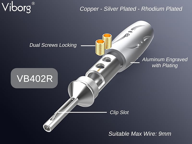Viborg VB402R su vrhunski bananski konektori za audiofile koji ne žele kompromise u prenosu signala između pojačala i zvučnika. Za razliku od standardnih konektora koji su često od mesinga, ovi su izrađeni od čistog crvenog bakra, što drastično poboljšava provodljivost.